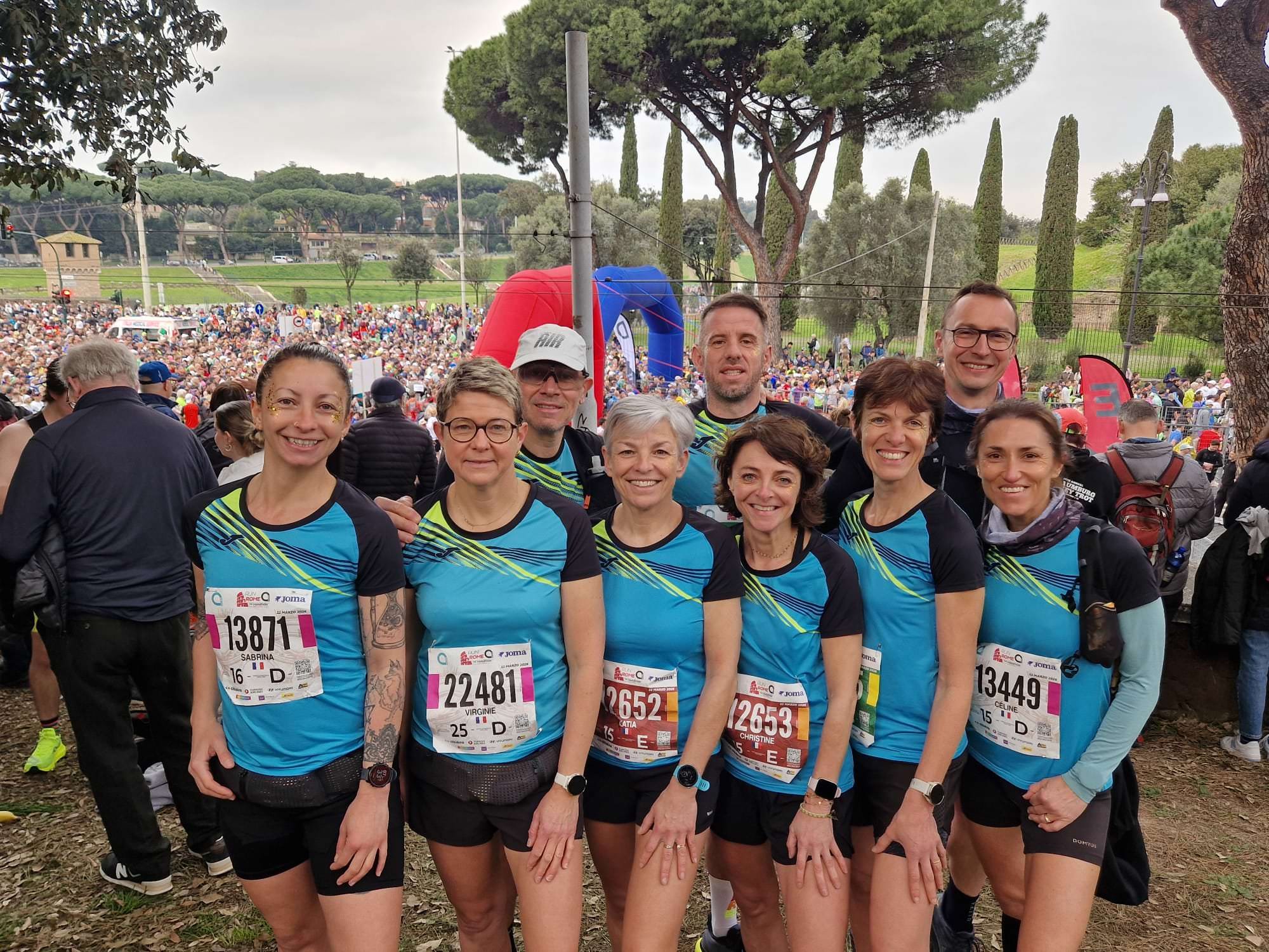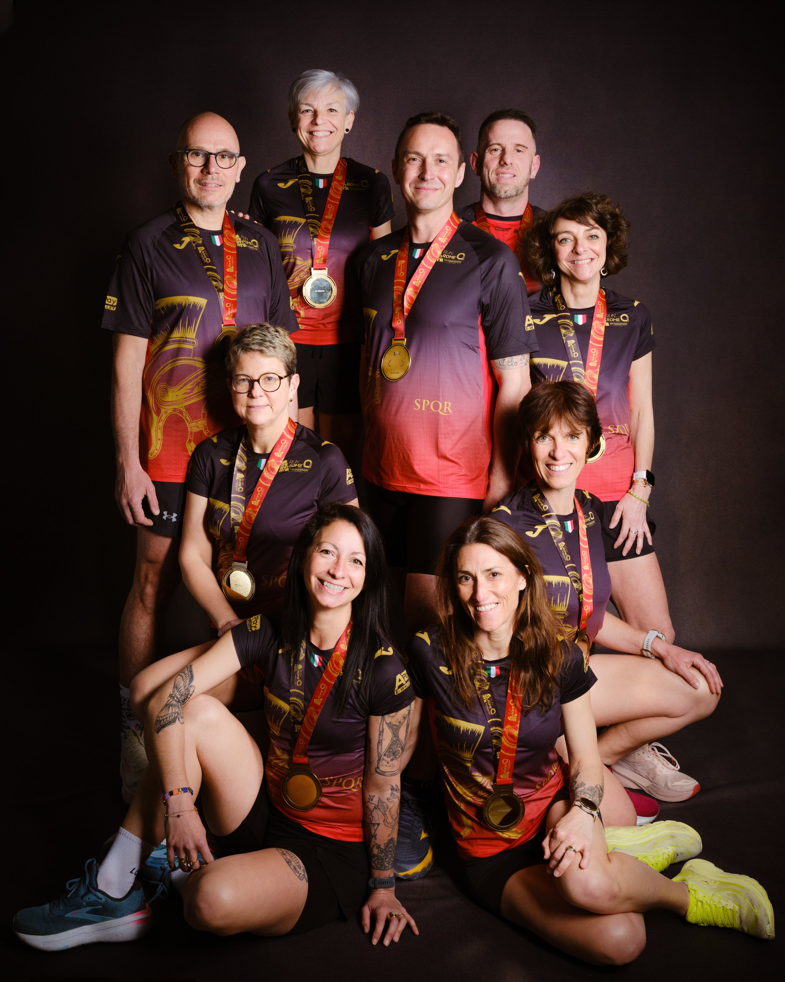Une semaine plus tard, l'équipe débarquait dans mon studio à Vitry-le-François. Reposés. Souriants. Fiers — et ça se voyait. Les mêmes personnes que sur la photo prise avant le départ, mais cette fois dans des conditions optimales : lumière maîtrisée, pose travaillée, regards assumés. Leurs médailles autour du cou, leurs tenues SPQR — Senatus Populusque Romanus, "le Sénat et le peuple romain", la devise gravée dans la pierre de la ville depuis l'Antiquité — et cette fierté, cette joie de ceux qui ont relevé le défi et sont allés jusqu’au bout ! Chacun a amélioré son record personnel, ou a participé pour la première fois, ce qui est déjà une grande victoire de mon point de vue.